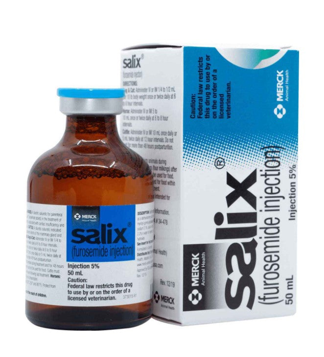 Salix 5% Injection is a diuretic-saluretic for prompt relief of edema in horses, cattle, dogs and cats. Salix 5% Injection contains furosemide. Each ml contains 50 mg furosemide. Salix 5% Injection is administered intramuscularly (IM) or intravenously. The usual dosage of Salix 5% Injection for cattle is 10 ml (500 mg) once daily or 5 ml (250 mg) twice daily at 12 hour intervals. The usual dosage of Salix 5% Injection for horses is 5-10 ml (250-500 mg) once or twice daily at 6 to 8 hour intervals. The usual dosage of Salix 5% Injection for dogs and cats is 1/4 to 1/2 ml per 10 lbs body weight given once or twice daily, permitting a 6 to 8 hour interval between treatments. Furosemide.
